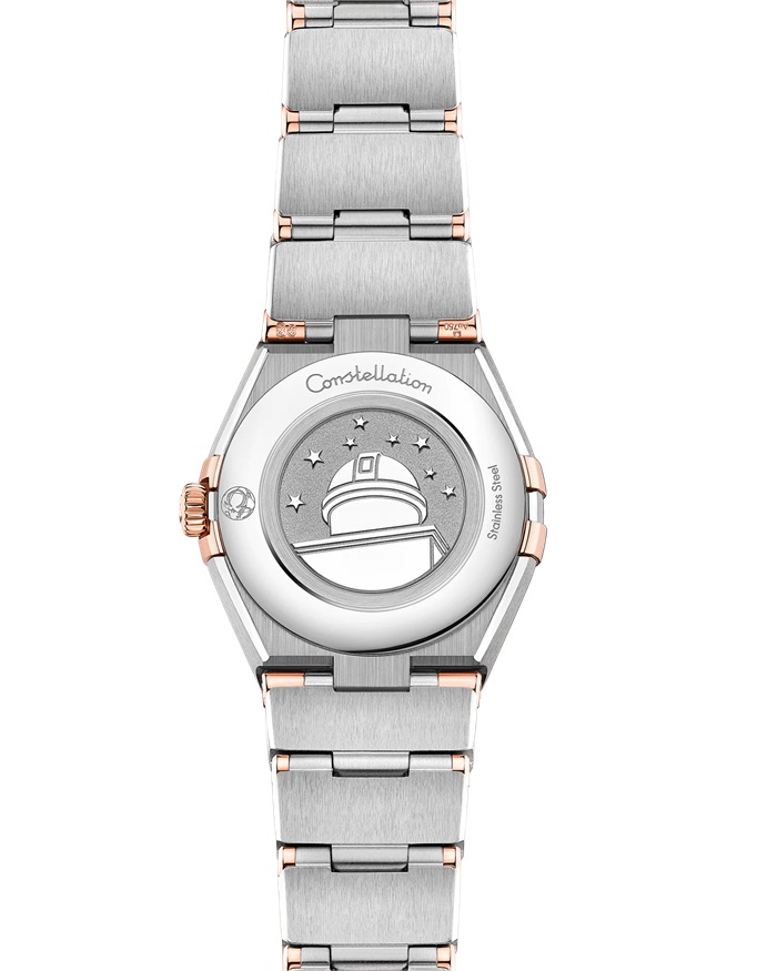 This 25 mm 18K Sedna™ gold and stainless steel model features a bezel engraved with Roman numerals, sun-brushed brown dial and scratch-resistant saphire crystal. The hands, OMEGA logo, Constellation star and diamond holders are also in 18K Sedna™ gold.