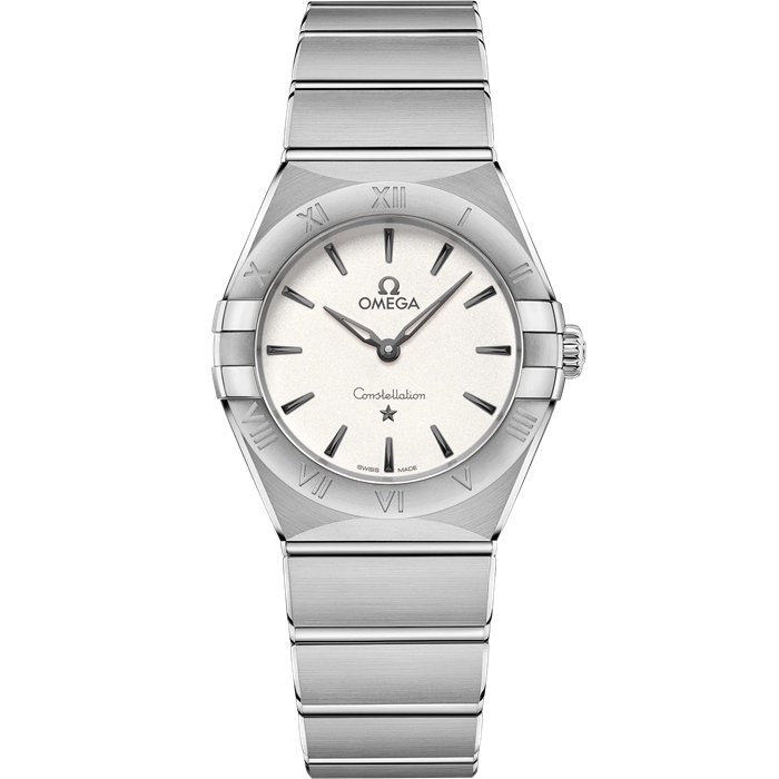 This 28 mm stainless steel model features a bezel engraved with Roman numerals, crystal white silvery dial and scratch-resistant saphire crystal. The blackened hands, OMEGA logo, Constellation star and indexes contrast beautifully with the white dial.