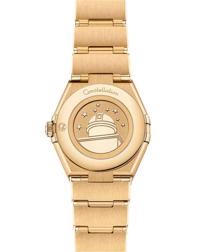 This 28 mm 18K yellow gold model features a diamond-paved bezel, white mother-of-pearl dial with diamond hour markers and scratch-resistant sapphire crystal. The bracelet, hands, OMEGA logo, Constellation star and diamond holders are also in 18K yellow gold.
