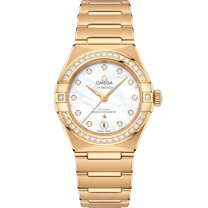 This 29 mm 18K yellow gold model features a diamond-paved bezel, pearled mother-of-pearl dial with diamond hour markers and a date window at the 6 o’clock position. The bracelet, hands, OMEGA logo, Constellation star and diamond holders are also in 18K yellow gold.