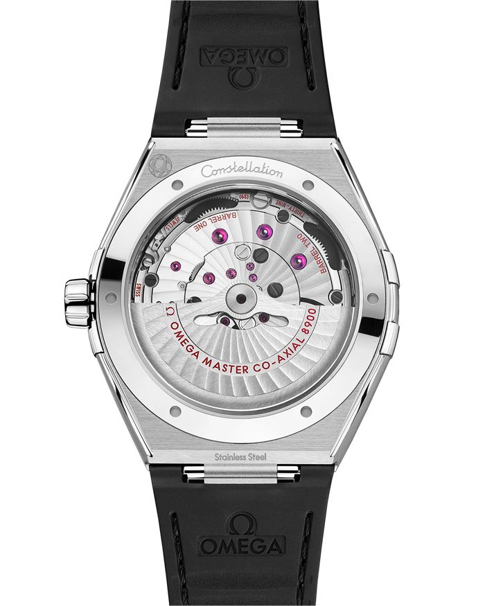 This 41 mm stainless steel model features coloured Roman numerals on the bezel, a silk-embossed rhodium-grey dial and a date window at the 6 o’clock position. The hands, OMEGA logo, Constellation star and facetted indexes are all blackened.