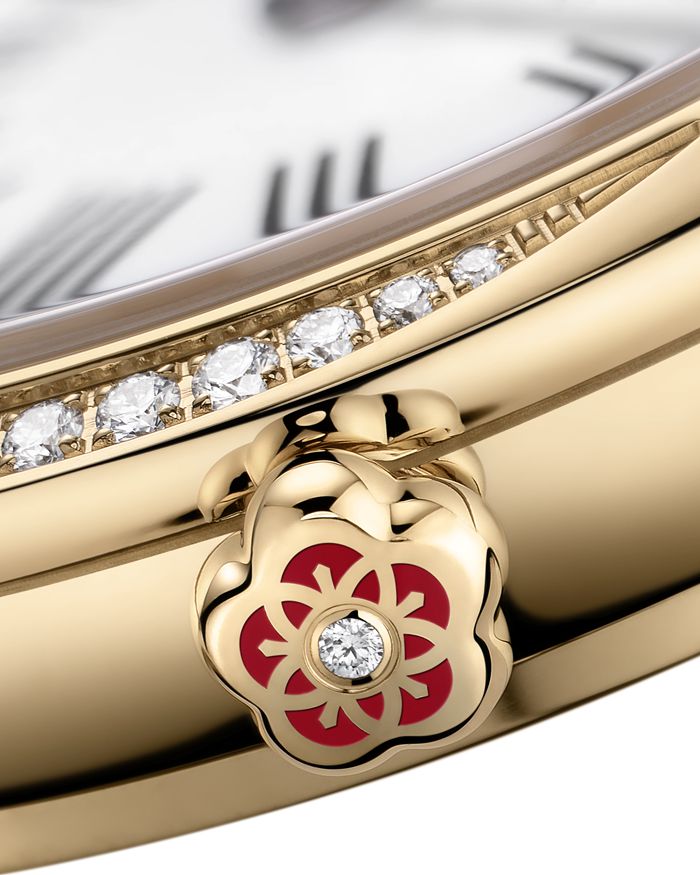 This model in 18K Moonshine™ Gold features a 26 mm case with diamonds that elegantly curve along each side. There is also a single diamond set in the crown, surrounded by a red liquid ceramic flower. The domed dial is crafted in off-white “Grand Feu” enamel and is presented with blackened hands and transferred Roman Numeral indexes.