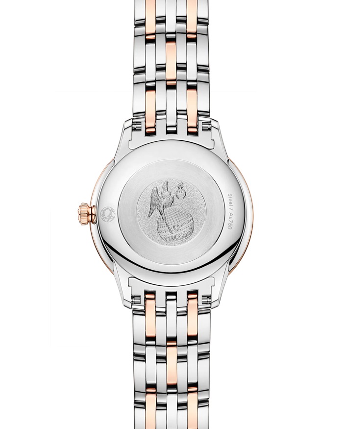 In this 27.5 mm stainless steel – 18K Sedna™ Gold model, the silvery dial features a stamped random vertical pattern in a sun-brushed finish. The display is distinguished by PVD Sedna™ Gold coloured hands, as well as alternating Roman numerals and cabochon indexes. The pure look of the timepiece is completed by a full caseback embossed with a God Chronos medallion.