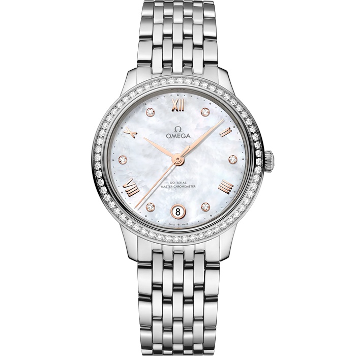 This 34 mm stainless steel model features a diamond-paved bezel and a dial crafted from white mother-of-pearl. The display is distinguished by PVD Sedna™ Gold coloured hands, as well as alternating Roman numerals and diamond markers that are set in 18K Sedna™ Gold holders.