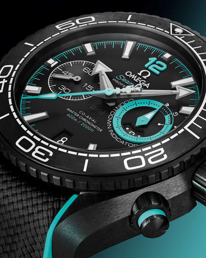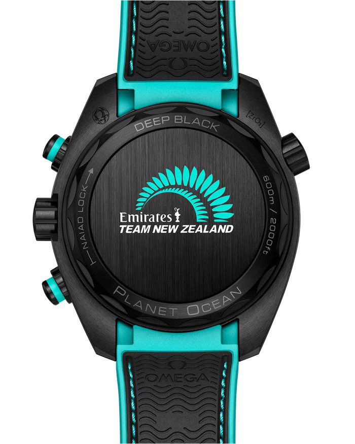 On the matt ceramic dial, OMEGA has included a nod to pre-race protocol with a COUNTDOWN INDICATOR at 3 o’clock complete with flagged START. The indicator’s hand and subdial ring are in ETNZ logo turquoise, along with the minute track, number 12 and central seconds chronograph hand with America’s Cup trophy counterwatch_case_weight. OMEGA has also included the colour on the rings of the brushed black ceramic pushers, the HE on the helium escape valve and the OMEGA logo on the crown.