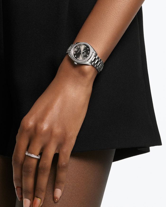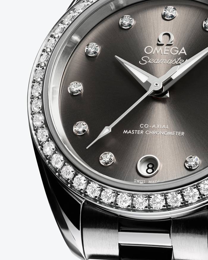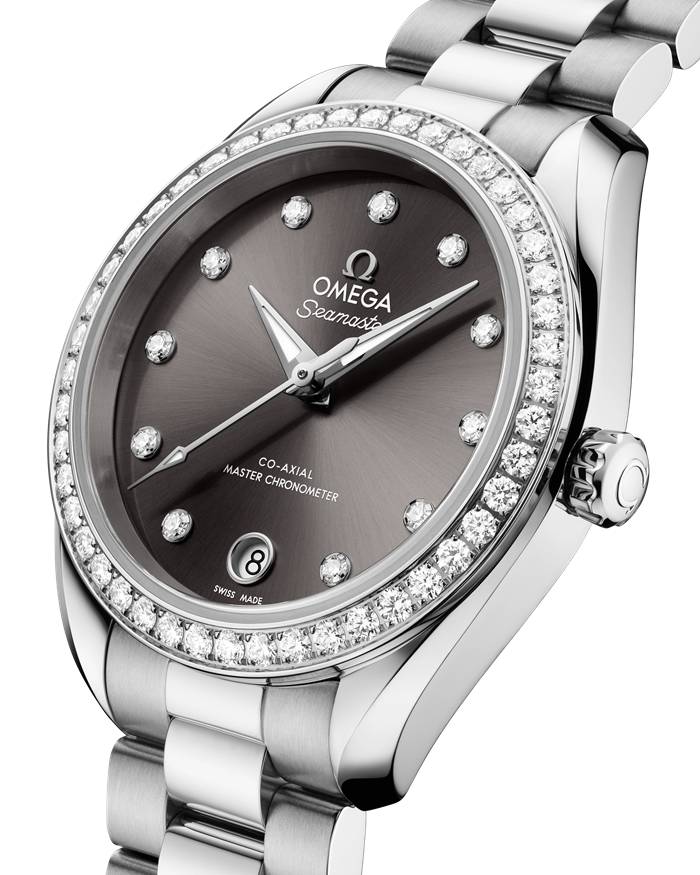 The grey dial is sun-brushed, PVD colour-treated and lacquered, with a circular date window at 6 o’clock. It is highlighted by 11 diamond hour markers and redesigned faceted hands, with the minute hand tapering to a delicate point. All the applied elements and hands are in 18K white gold, while the hands are also filled with white Super-LumiNova which emits a blue glow.