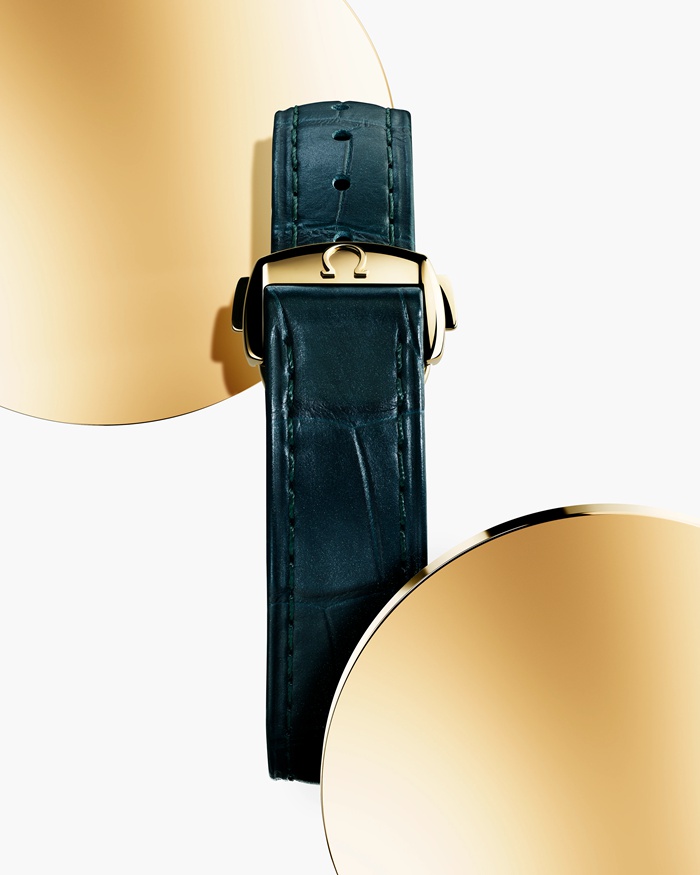 The sun-brushed and lacquered dial is CVD-treated and presented in a lagoon green colour, featuring an applied circular date window in 18K Moonshine™ Gold, and silver coloured transfers. 18K Moonshine™ Gold has been used to coat the facetted hands, and to create the hour-markers, which are shaped like sailboat hulls and filled with white Super-LumiNova.