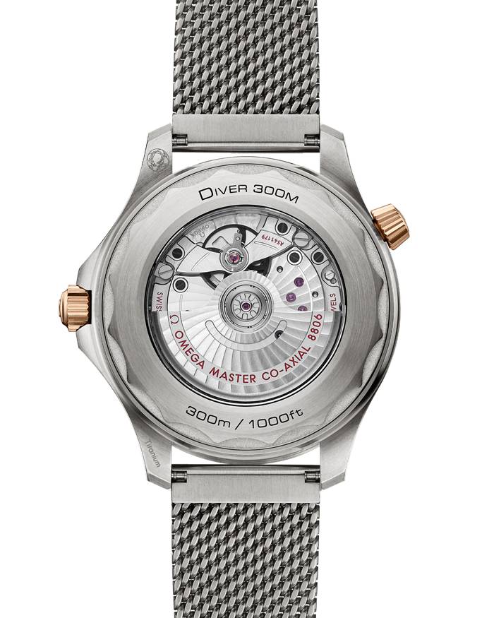 This 42 mm model is crafted in grade 2 titanium and OMEGA’s exclusive 9K Bronze Gold. It includes a green oxalic anodized aluminium bezel ring with a diving scale in vintage Super-LumiNova.