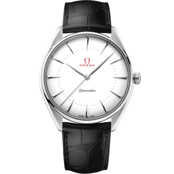 This 39.5 mm model has an 18K Canopus™ gold case and a black, leather strap. The domed dial is light, eggshell white enamel with a distinctive vintage OMEGA logo, minute track and Seamaster wording also in enamel. The “leaf” hands and applied indexes are 18K white gold.