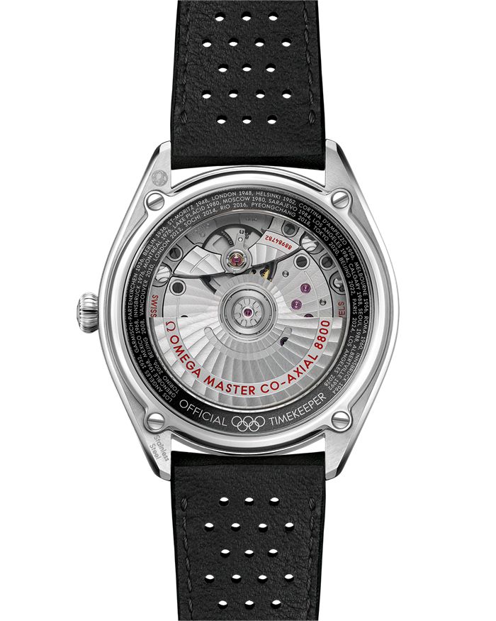 On the caseback, there is a black anodized aluminium ring which includes all known host cities and dates from OMEGA’s Olympic Games journey, from Los Angeles 1932 up to Los Angeles 2028.