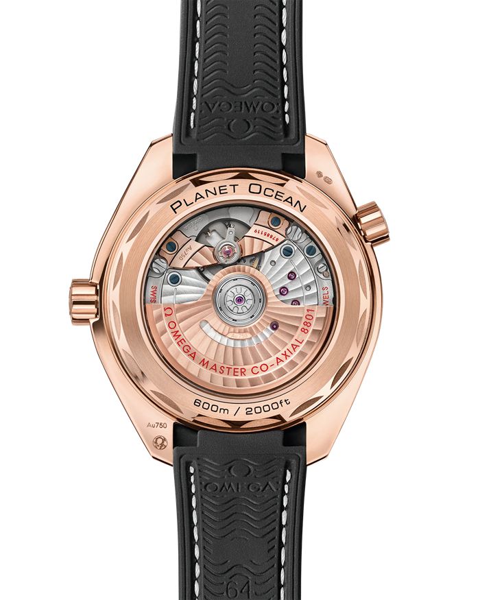 This model, with its scratch-resistant sapphire crystal, features a chocolate brown ceramic dial with Arabic numerals and a date window at the 3 o’clock position. The brown ceramic unidirectional bezel with OMEGA Ceragold™ diving scale is mounted on a 39.5 mm 18K Sedna™ gold case.