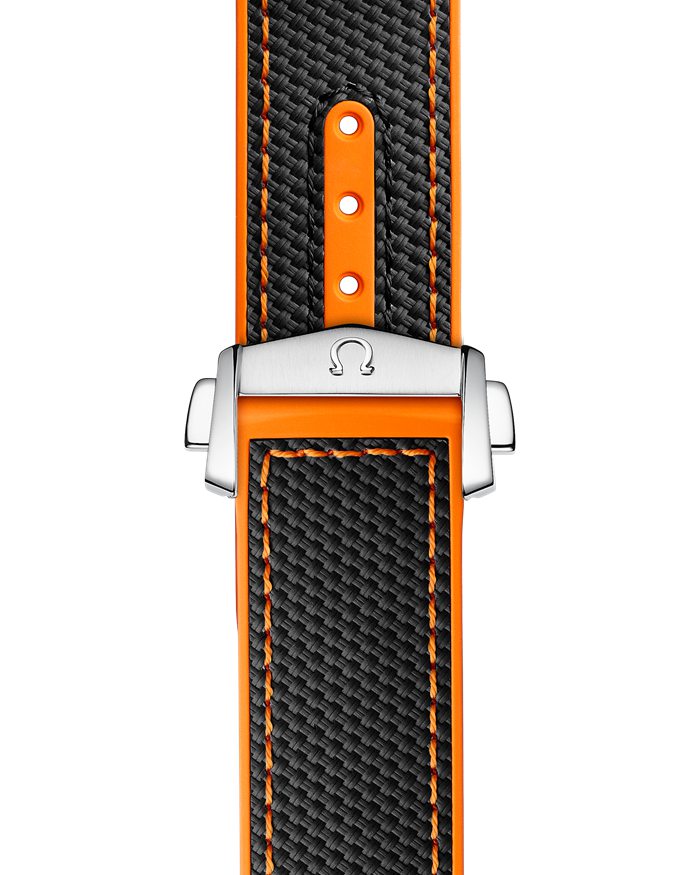 Other features include an alveol screw-in caseback and a black structured rubber strap with orange stitching and lining.