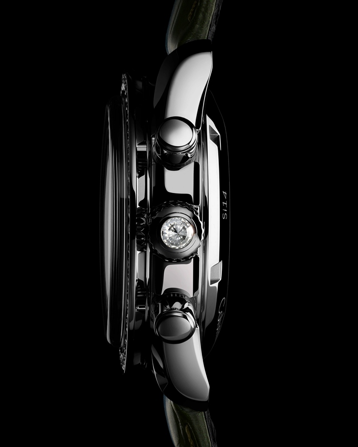 The green PVD dial includes horizontal oval subdials with silvery coating and a vertical oval date window at 6 o’clock. The hour/minute hands are diamond-polished rhodium-plated and filled with white Super-LumiNova which emits a green glow.