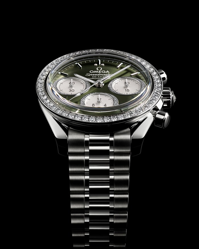 The green PVD dial includes horizontal oval subdials with silvery coating and a vertical oval date window at 6 o’clock. The hour/minute hands are diamond-polished rhodium-plated and filled with white Super-LumiNova which emits a green glow.