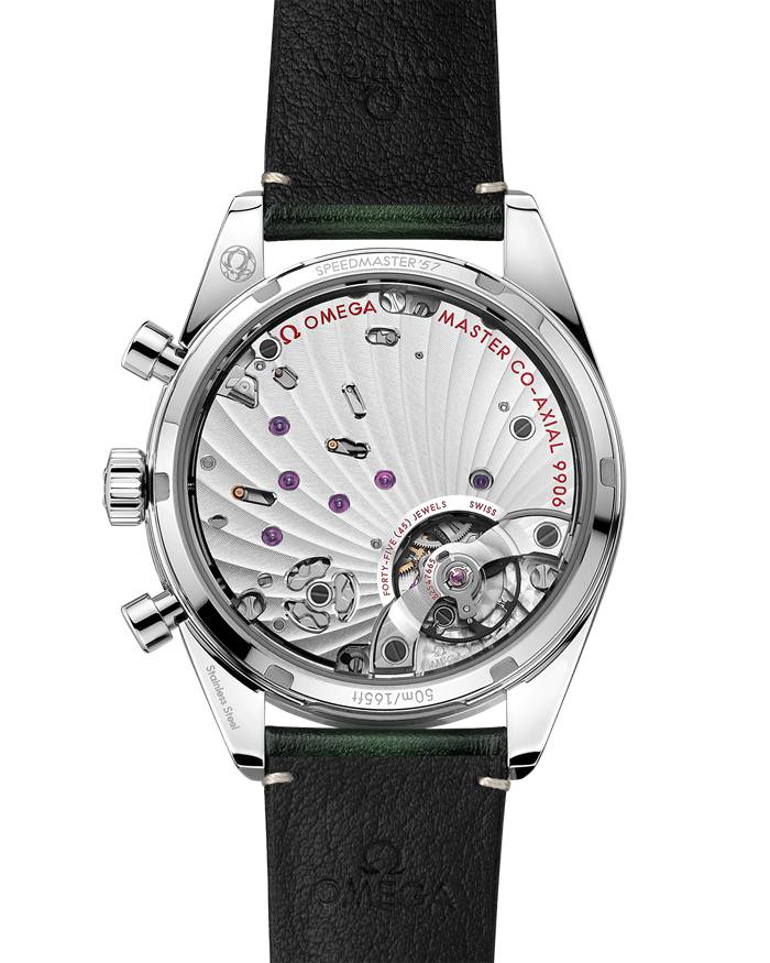 The brushed bezel includes a blackened tachymeter scale, while on the caseback, there is a “Speedmaster ‘57” engraving as well as a flat sapphire crystal with an anti-reflective treatment inside.