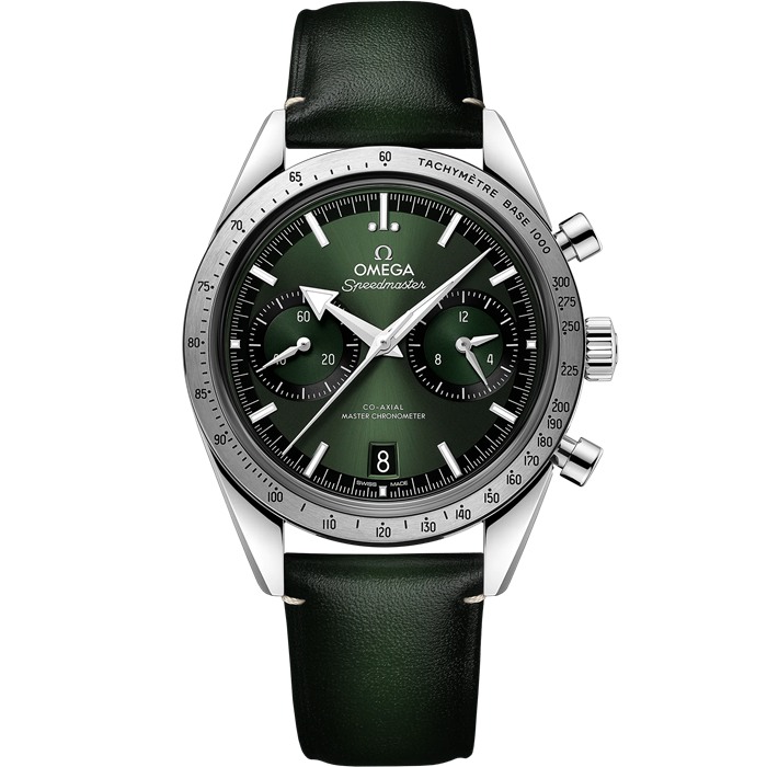 This 40.50 mm model, inspired by the legendary 1957 original, features a stainless steel case and a green dial with rhodium-plated hour markers and “Broad Arrow” hands – all featuring white Super-LumiNova. There is a date window at 6 o’clock, a small seconds subdial at 9 o’clock, and 12-hour and 60-minute chronograph recorders on the subdial at 3 o’clock.