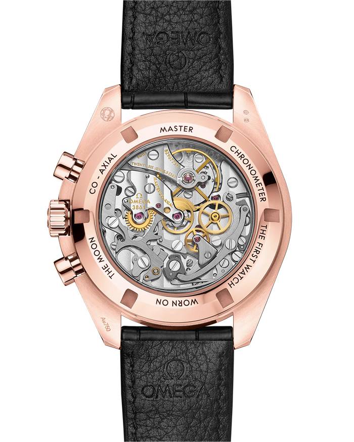 Presented on a black leather strap, this 42 mm Moonwatch in 18K Sedna™ gold features sapphire crystal glass on the front as well as on the caseback. Inspired by the 4th generation Speedmaster style worn on the moon, it also includes an asymmetrical case, black step dial and the famous dot over 90 on the anodised aluminium bezel ring.