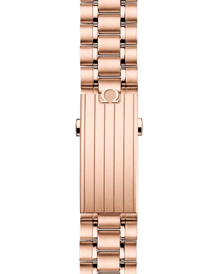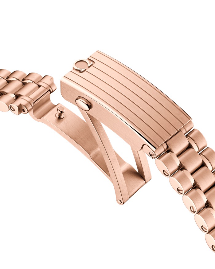Presented on a five-arched-links-per-row bracelet, this 42 mm Moonwatch in 18K Sedna™ Gold features sapphire crystal glass on the front as well as on the caseback. Inspired by the 4th generation Speedmaster style worn on the moon, it also includes a brown step dial and an asymmetrical case with diamond-paved bezel.