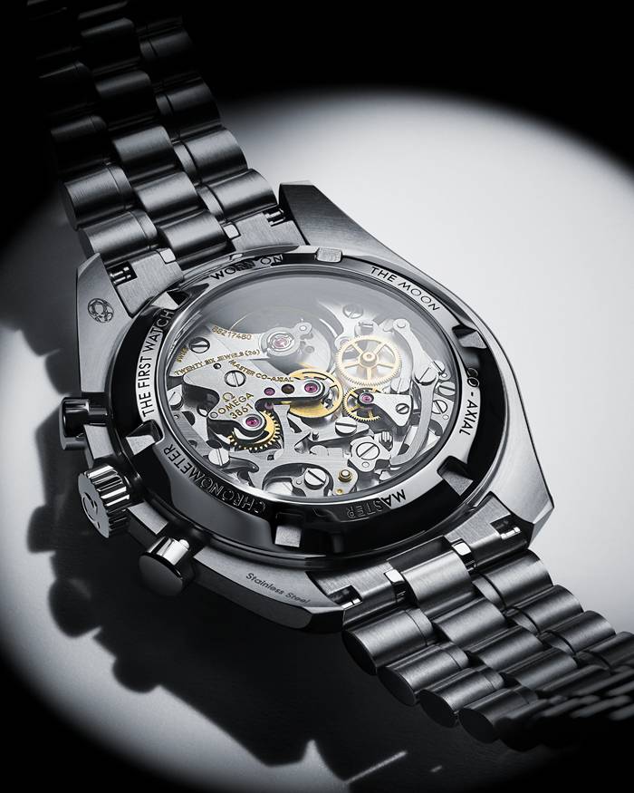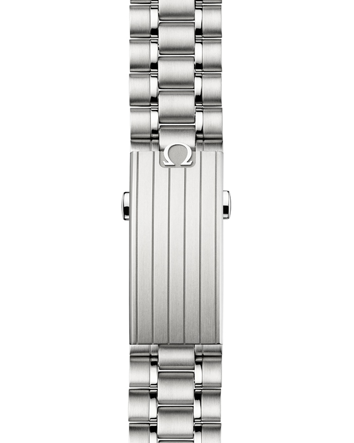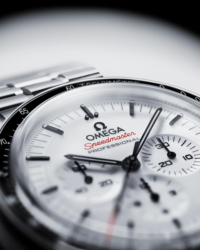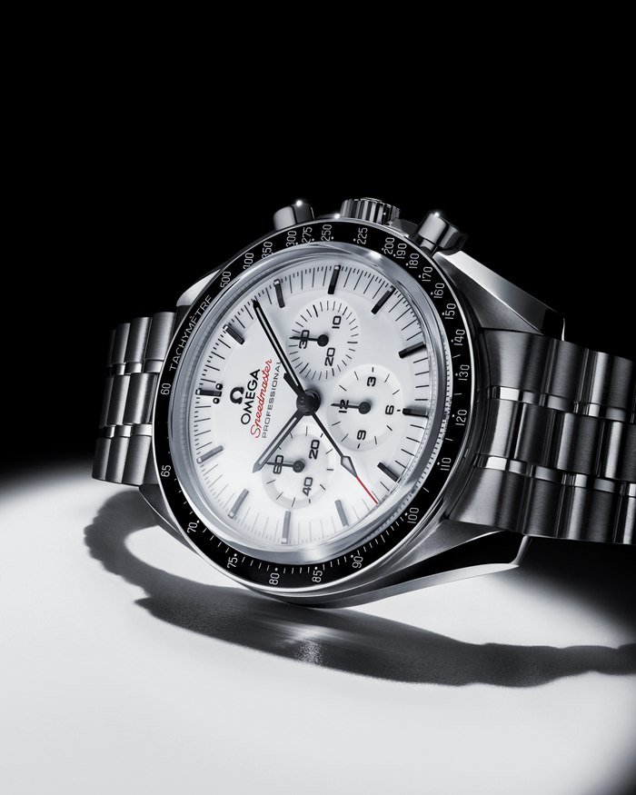 Presented on a polished-brushed bracelet, this 42 mm Moonwatch in stainless steel features sapphire crystal glass on the front as well as on the caseback. Inspired by the 4th generation Speedmaster style worn on the moon, it also includes an asymmetrical case, a white lacquered step dial with applied OMEGA logo and indexes, Moonwatch style hands, and the famous dot over 90 on the black anodised aluminium bezel ring.