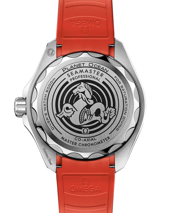 This 45.5 mm model in robust O-MEGASTEEL features a polished orange ceramic bezel with its diving scale in liquid ceramic and Super-LumiNova. Through the protuberant and domed sapphire crystal, the lacquered gradient dial transitions from grey to black, and has been given four Arabic numerals in orange, as well as 18K white gold hands and hour markers, which are all coated with white Super-LumiNova.